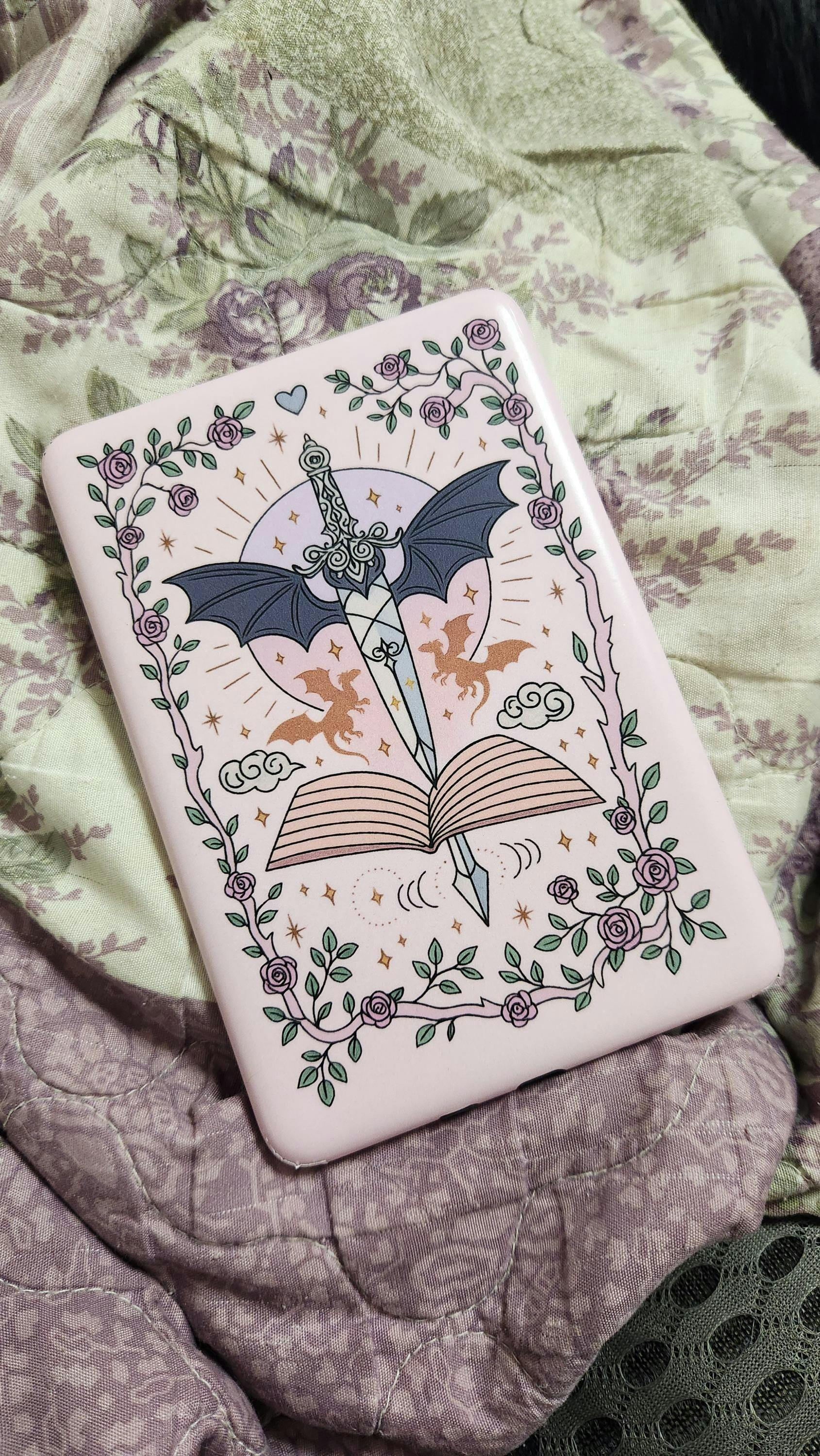 Transform your Kindle into a magical accessory with this fantasy-inspired Kindle skin.  Featuring a pink backdrop with a sword, dragons, roses, and enchanted details, this premium vinyl decal protects your device from scratches while giving it a unique fairy-tale aesthetic. Perfect for readers who love fantasy books, magical worlds, and coquette-inspired designs.